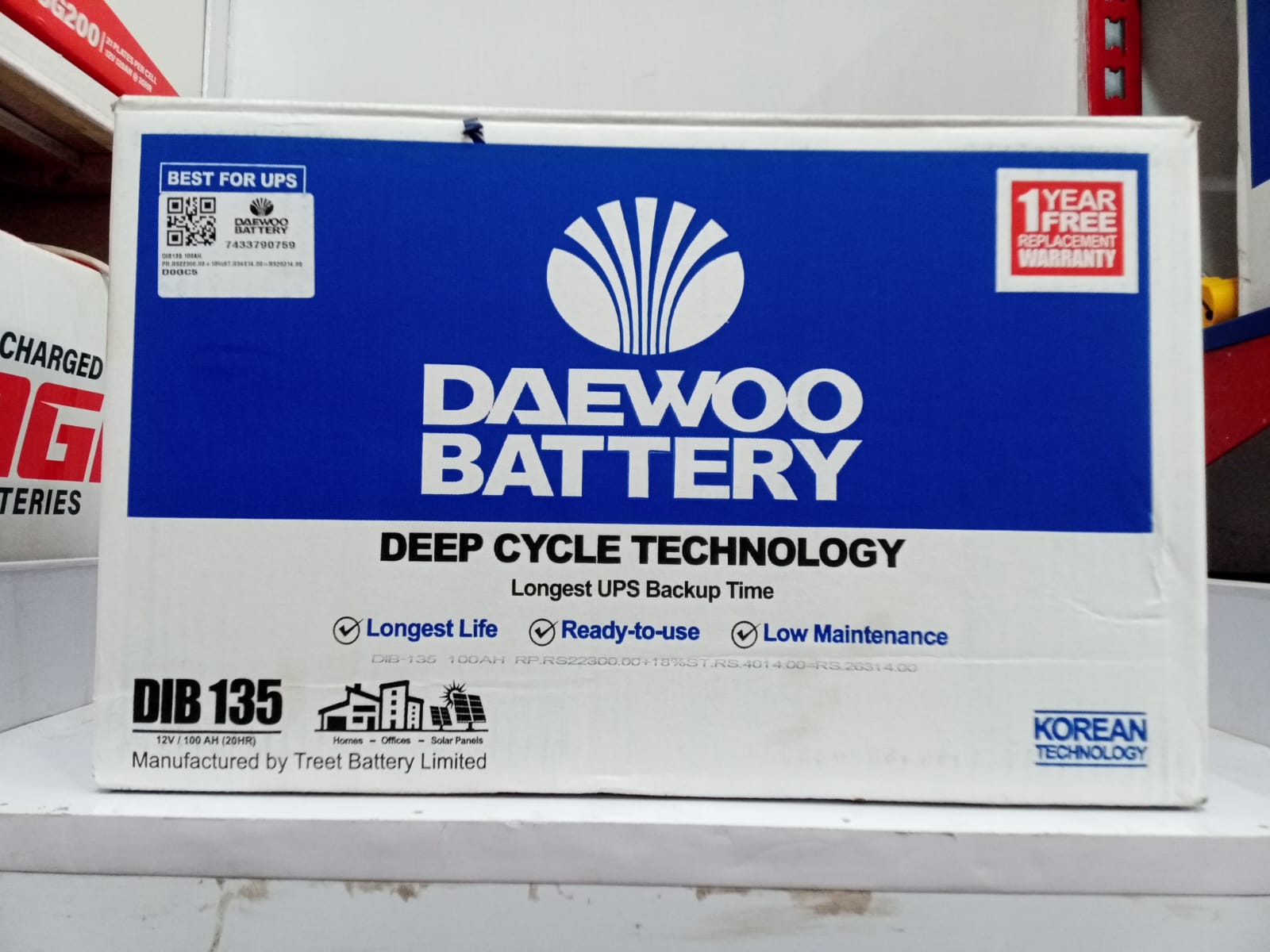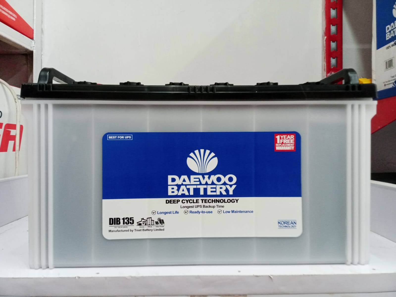 The Daewoo DIB 135 is a 12V / 100Ah low-maintenance deep-cycle battery designed to provide reliable and long-lasting backup power for UPS and solar systems. Built using advanced deep-cycle technology, it allows deeper discharge and longer backup time compared to ordinary batteries. Its durable construction and stable performance make it suitable for homes, offices, and small commercial power backup setups. Comes with a 1-year warranty for dependable operation and peace of mind.